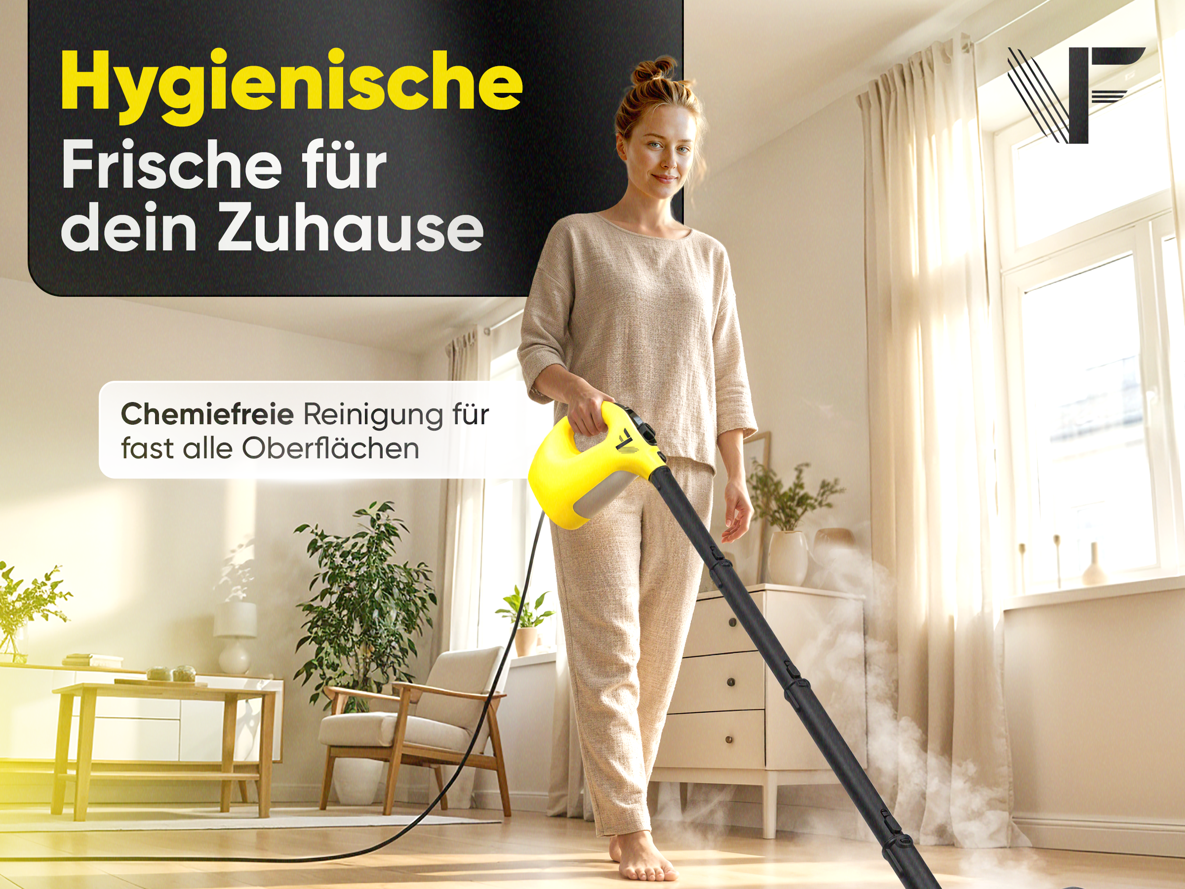 Ja, genau das ist der Vorteil! Der Dampfreiniger arbeitet ausschließlich mit heißem Wasserdampf – ganz ohne Chemikalien. So reinigst du hygienisch, umweltfreundlich und schonend für Oberflächen.